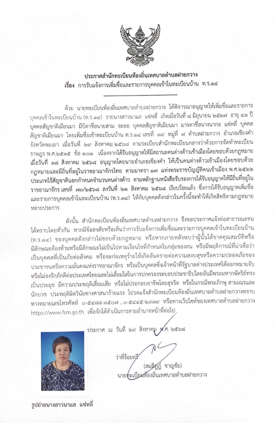 รายละเอียด : วันอังคารที่ 19 สิงหาคม 2568 สำนักทะเบียนท้องถิ่นเทศบาลตำบลฝายกวาง โดยว่าที่ร้อยตรีสมสิฎฎ์ ชาญชัย ได้พิจารณาอนุญาตให้เพิ่มชื่อและรายการบุคคลในทะเบียนบ้าน (ท.ร.14) ตามระเบียบสำนักทะเบียนกลางว่าด้วยการจัดทำทะเบียนราษฎร พ.ศ.2535 ข้อ 101 จำนวน 1 ราย ให้กับนางสาวนาแล แซ่หลี่ กรณีได้รับอนุญาตให้มีสถานะคนต่างด้าวเข้าเมืองโดยชอบด้วยกฎหมาย เมื่อวันที่ 14 สิงหาคม 2568 อนุญาตโดยนายอำเภอเชียงคำ ให้เป็นคนต่างด้าวเข้าเมืองโดยชอบด้วยกฎหมายและมีถิ่นที่อยู่ในราชอาณาจักรไทย ตามมาตรา 17 แห่งพระราชบัญญัติคนเข้าเมือง พ.ศ.2522 ประเภอไร้สัญชาตินอกกำหนดจำนวนคนต่างด้าว
